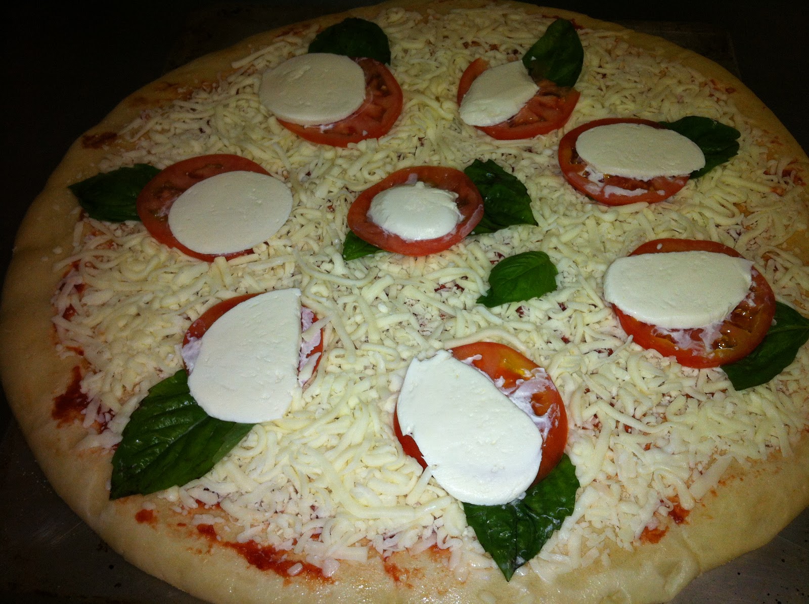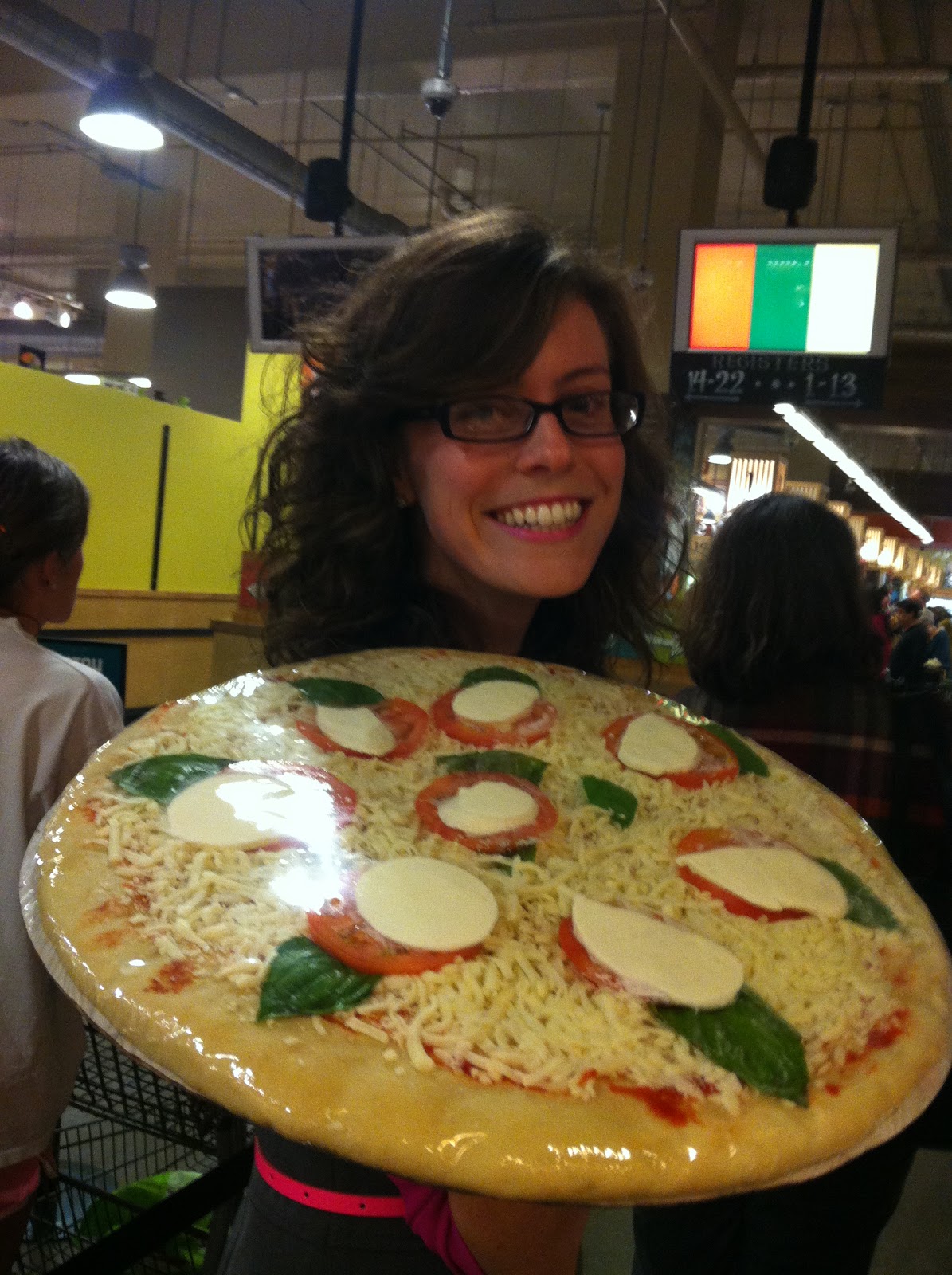 So, what did we get for dinner, you ask? Caprese pizzas, of course! These giant beauties were on sale 2 for $11.99, so, of course, we got both.